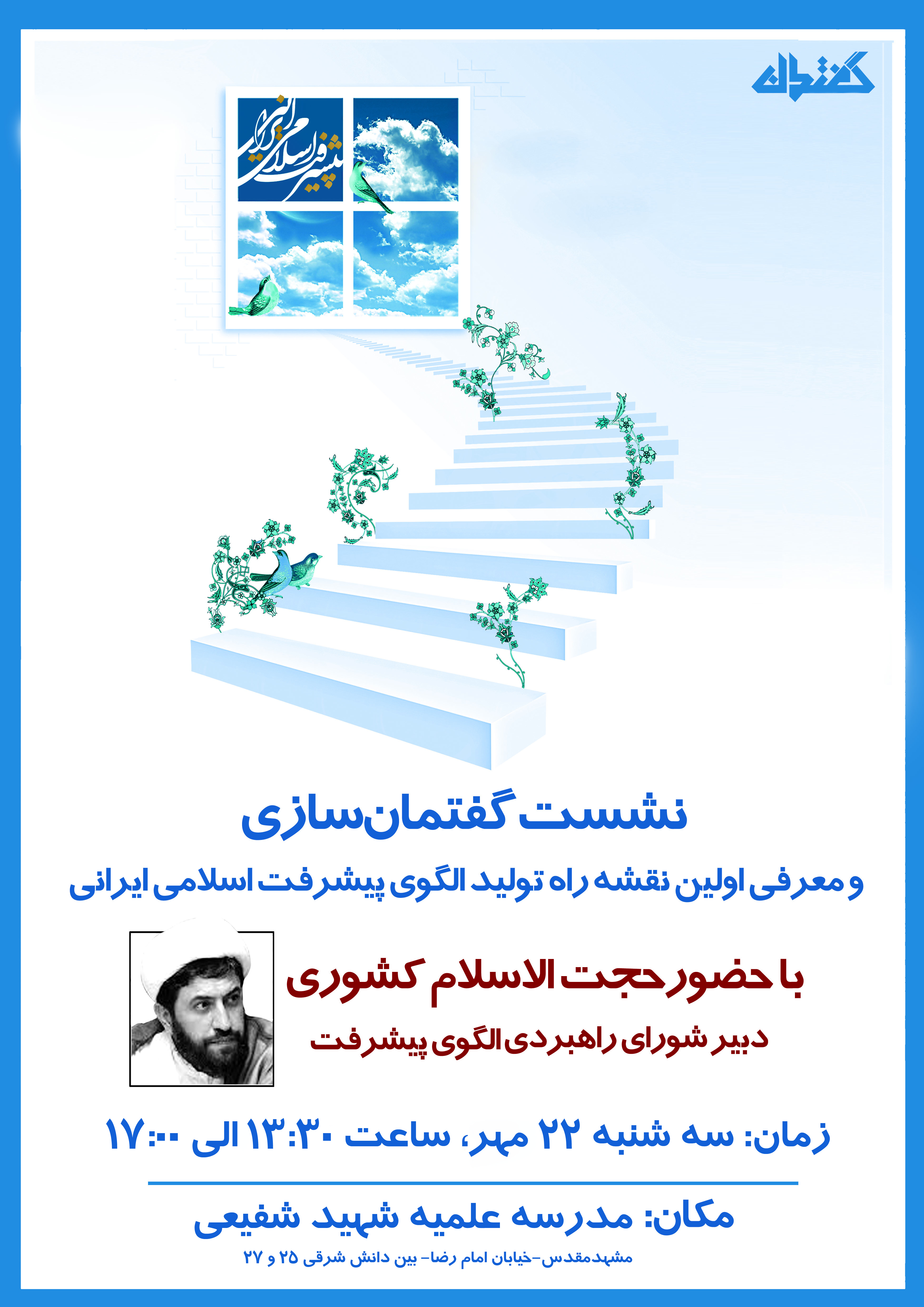 به مدد الهی نشست معرفی اولین نقشه راه تولید الگوی پیشرفت اسلامی، روز سه شنبه بیست و دوم مهر ماه، از ساعت 13:30 تا اذان مغرب در مدرسه علمیه شهید شفیعی برگزار خواهد شد.